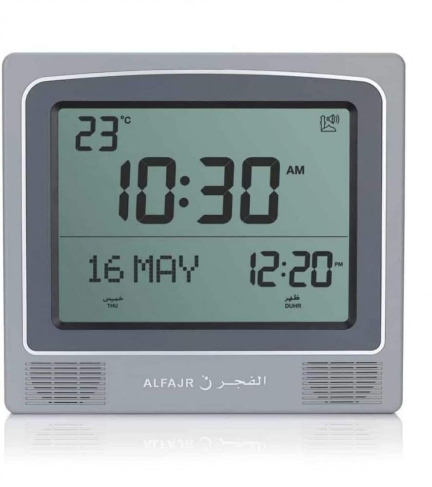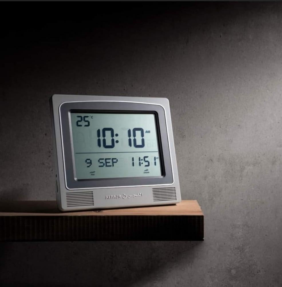 اجعل وقتك منظمًا وصلواتك دائمًا في وقتها مع ساعة الفجر الرقمية المصممة لتجمع بين الأناقة والدقة. تتميز الساعة بشاشة كبيرة وواضحة بقياس 8 بوصة لعرض الوقت، التاريخ، وأوقات الأذان لجميع المدن حول العالم. يمكن استخدامها كـ ساعة جدارية أو على الطاولة، مع إمكانية توصيلها بسماعات خارجية لزيادة وضوح صوت الأذان.
