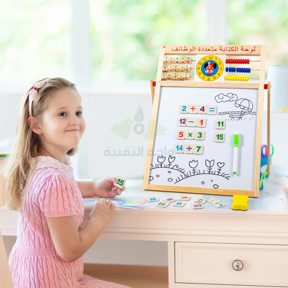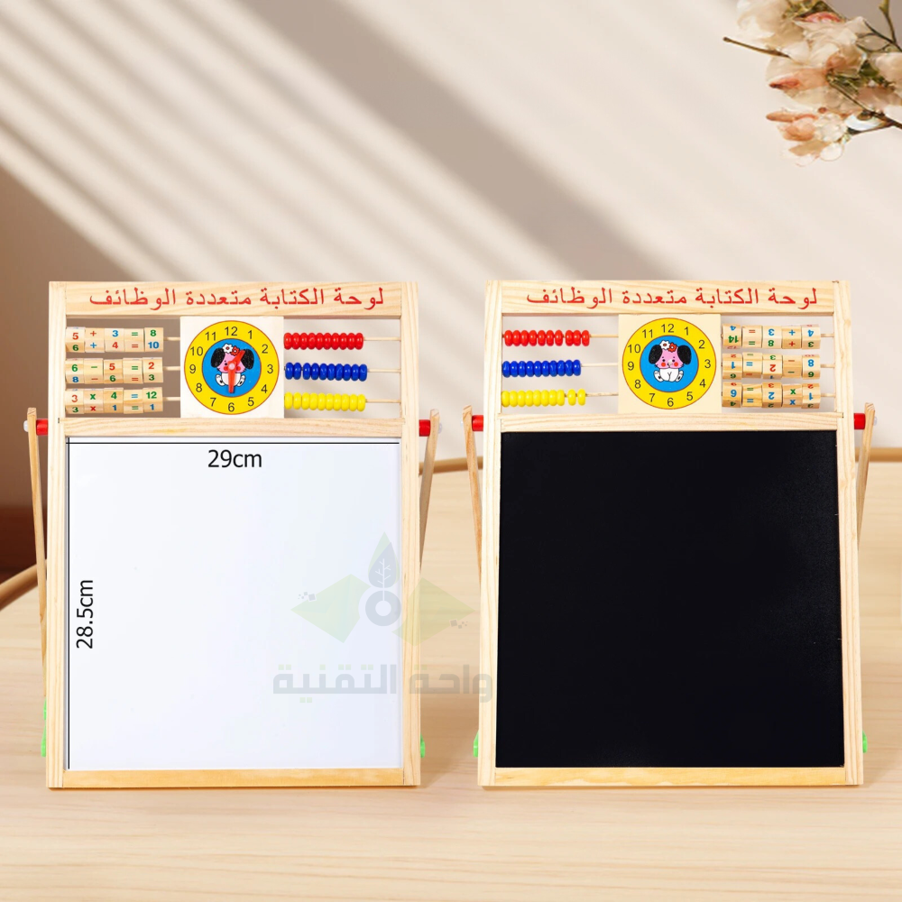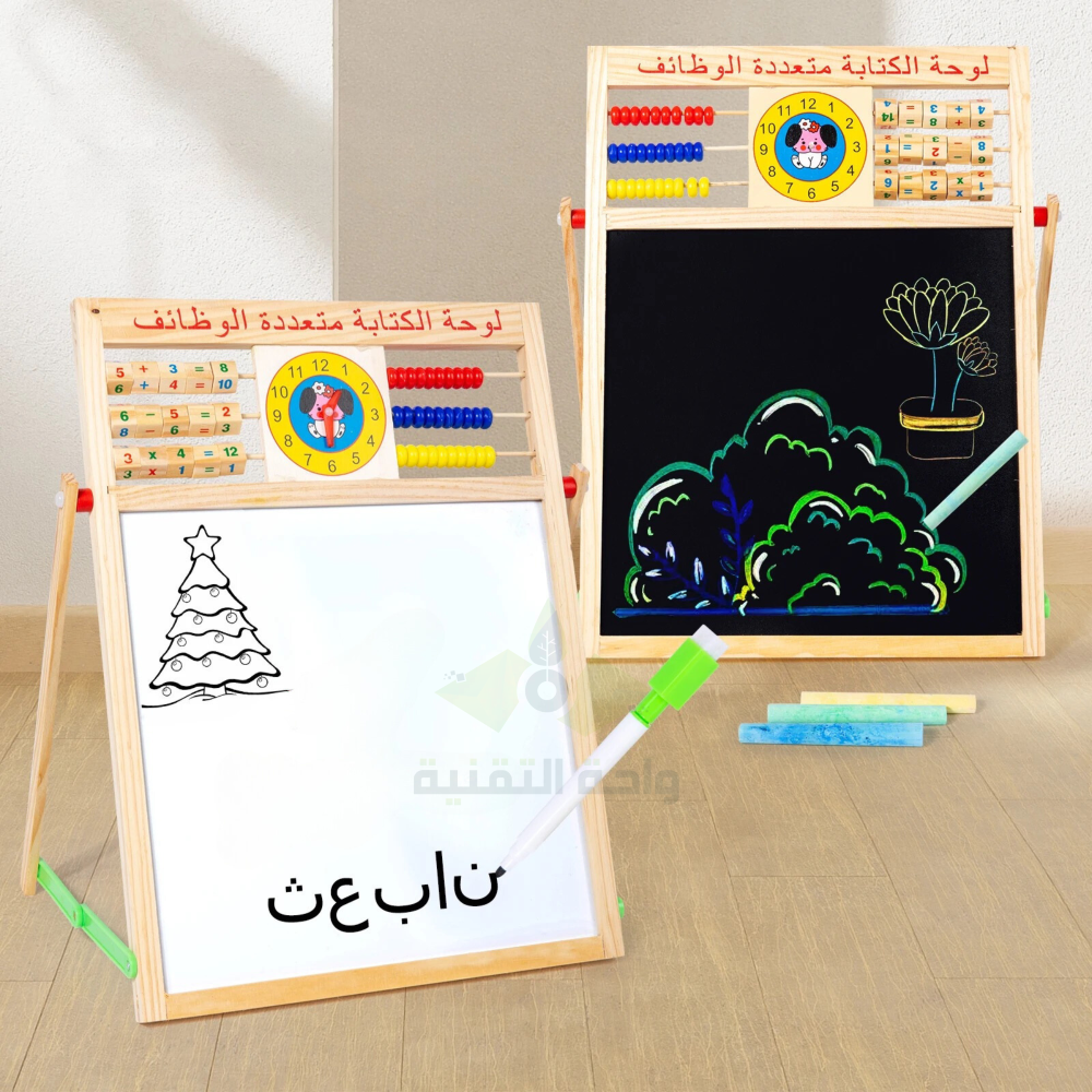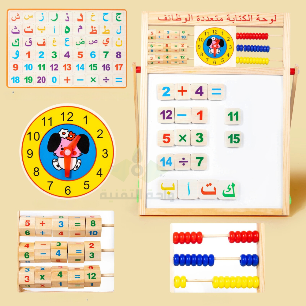لوحة تعليمية تحتوي على وجهين، وجه مغناطيسي يحتوي على جميع الحروف الهجائية والأرقام والعمليات الحسابية ، ووجه للكتابة باستخدام الطباشير.