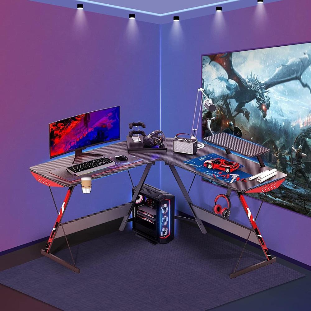 مكتب ألعاب مطلي بألياف الكربون على شكل حرف L في غرفة الألعاب