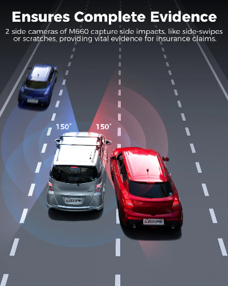 تمتع بأقصى درجات الأمان والمراقبة أثناء القيادة مع كاميرا داش كام m660، التي توفر 4 كاميرات بزاوية واسعة لتغطية شاملة للطريق و مقصورة السيارة. بفضل دقة 4K الفائقة، ستحصل على تسجيلات واضحة بجودة احترافية، مع GPS مدمج و WiFi 5G للاتصال السريع والمزامنة السهلة مع هاتفك.