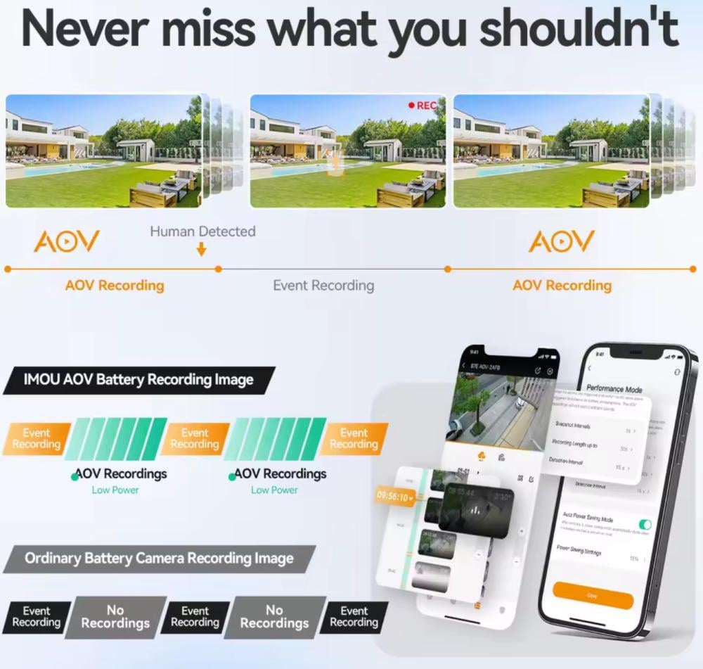 يستخدم AOV PT تقنية الفيديو الدائم التشغيل (AOV) الرائدة في الصناعة من IMOU، والتي تسمح للكاميرا بتسجيل إطار واحد كل ثانيتين للحفاظ على الذاكرة والطاقة في حالة عدم وجود حدث، ولكن يتحول على الفور إلى تسجيل كامل الإطار عند حدوث حدث، مما يلبي احتياجات التسجيل طوال اليوم وتوفير الطاقة.