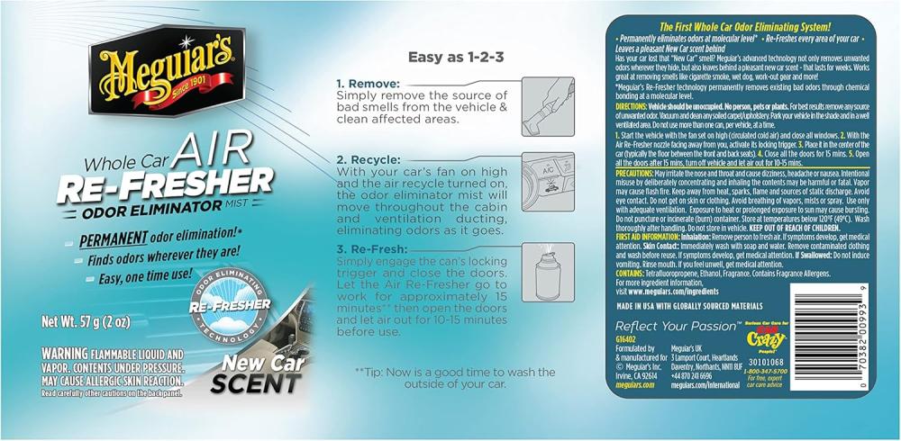 يستخدم للتخلص من الروائح الكريهة من السيارة نهائيًا. تتنقل الرائحة عبر نظام التهوية ومناطق صعب الوصول إليها ليترك رائحة منعشة وجميلة في السيارة. يعطي رائحة في السيارة مثل رائحة السيارة الجديدة