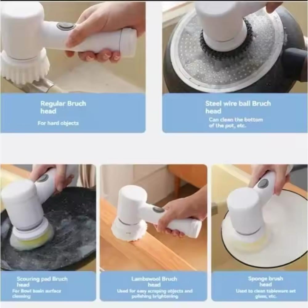 فرشاة تنظيف و غسيل الصحون المحمولة 5 في 1 مع 5 رؤوس لتنظيف لامع لمختلف الأسطح DC5V 5W 400mAh RECHARGEABLE CLEANING BRUSH من KW-48020