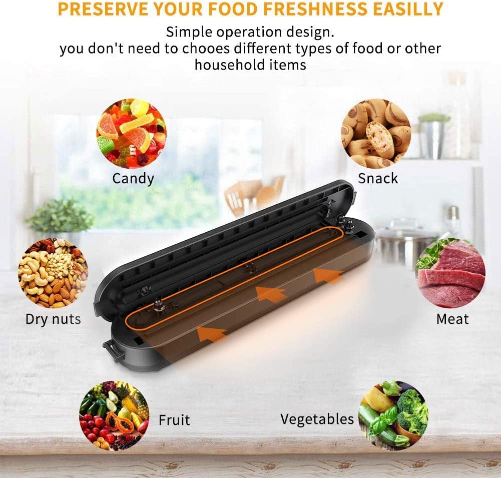 محمولة وسهلة التنظيف : حجم صغير وسهل الحمل. الجزء السفلي مقاوم للماء، فتحة تهوية خارجية، وميزة منخفضة الضوضاء معًا تجعلها آمنة ومريحة للاستخدام. يمكن إزالة أكياس ختم الطعام واستبدالها، كما أن التنظيف مريح.