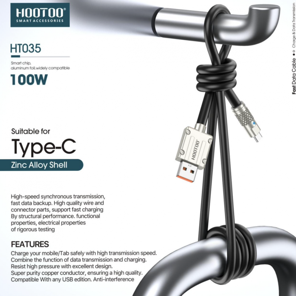 كيبل متين 100w بأطراف حديد من HOOTOO تايب سي Type-cموديل HT035