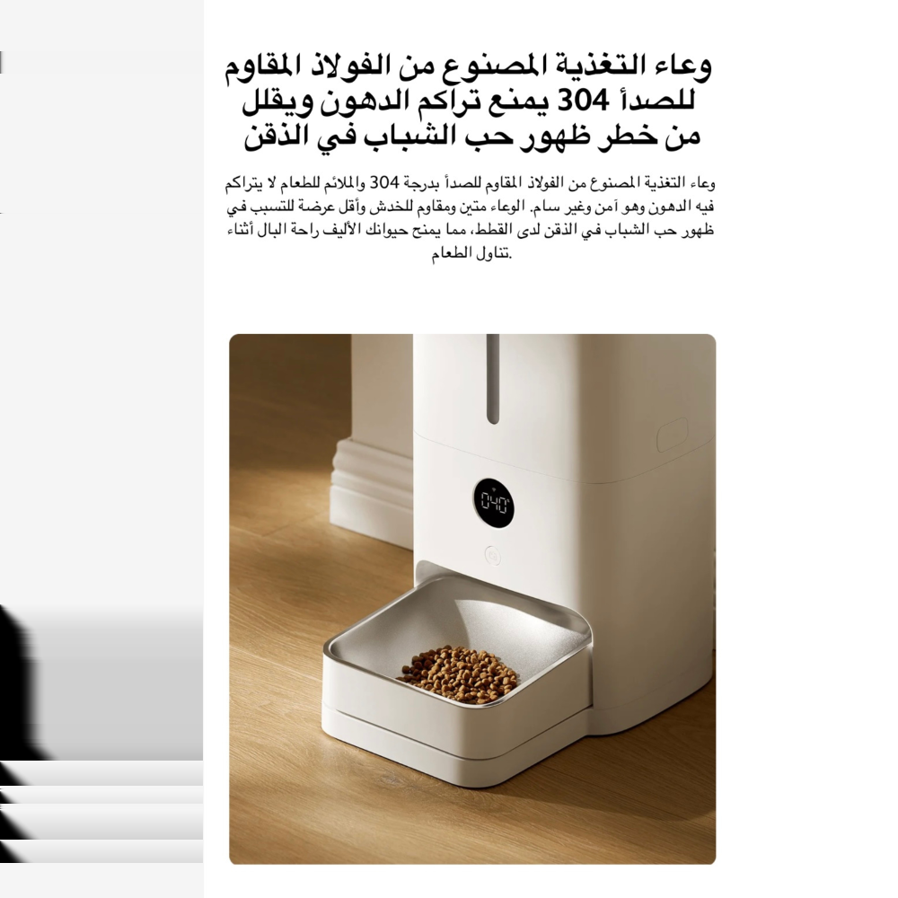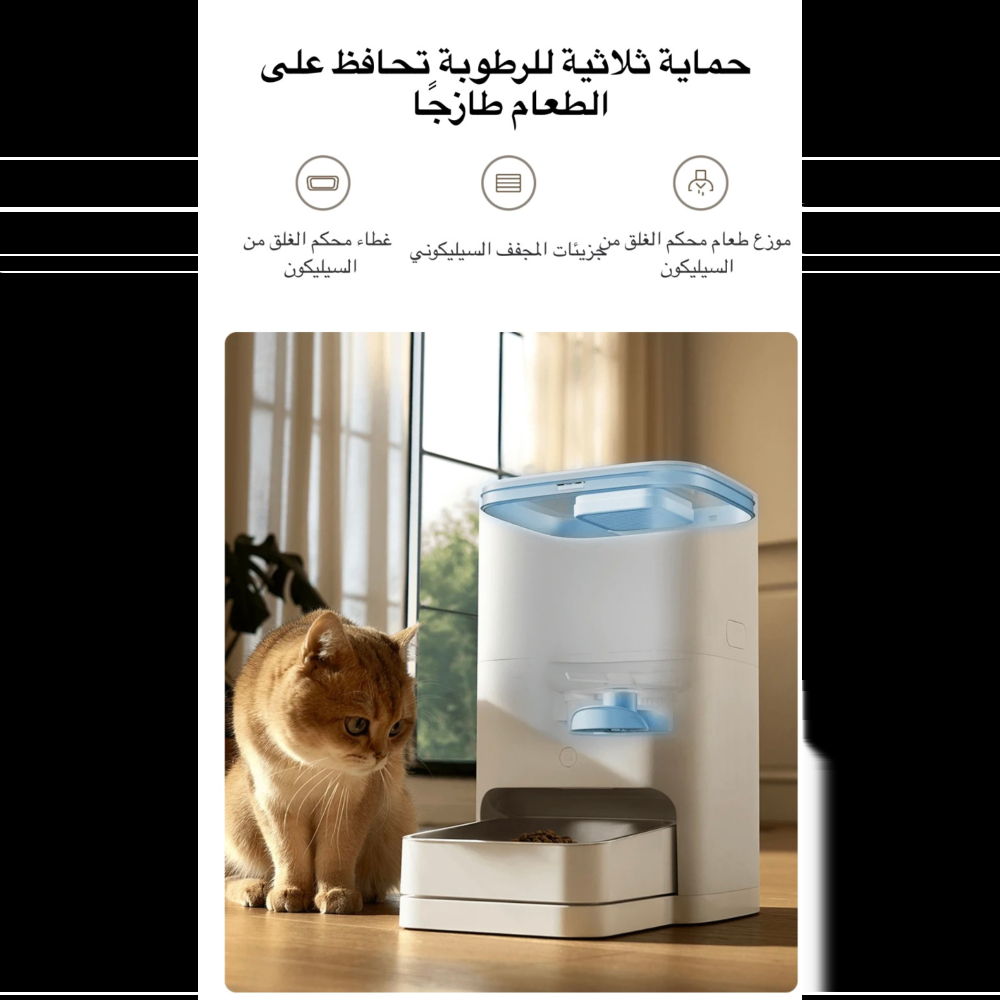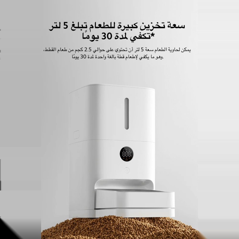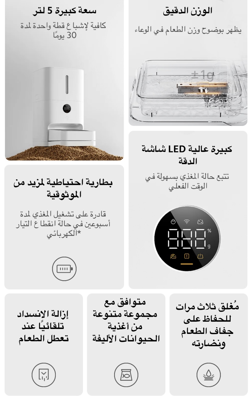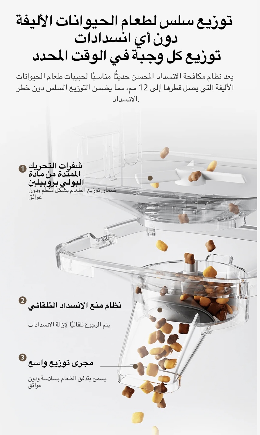 - توزيع آلي للطعام: يتيح التحكم الذكي في كمية وتوقيت توزيع الطعام، مما يساعد في الحفاظ على نمط تغذية منتظم وصحي لحيوانك الأليف. يمكن برمجة الموزع لتوزيع وجبات متعددة في اليوم بحسب حاجة الحيوان.