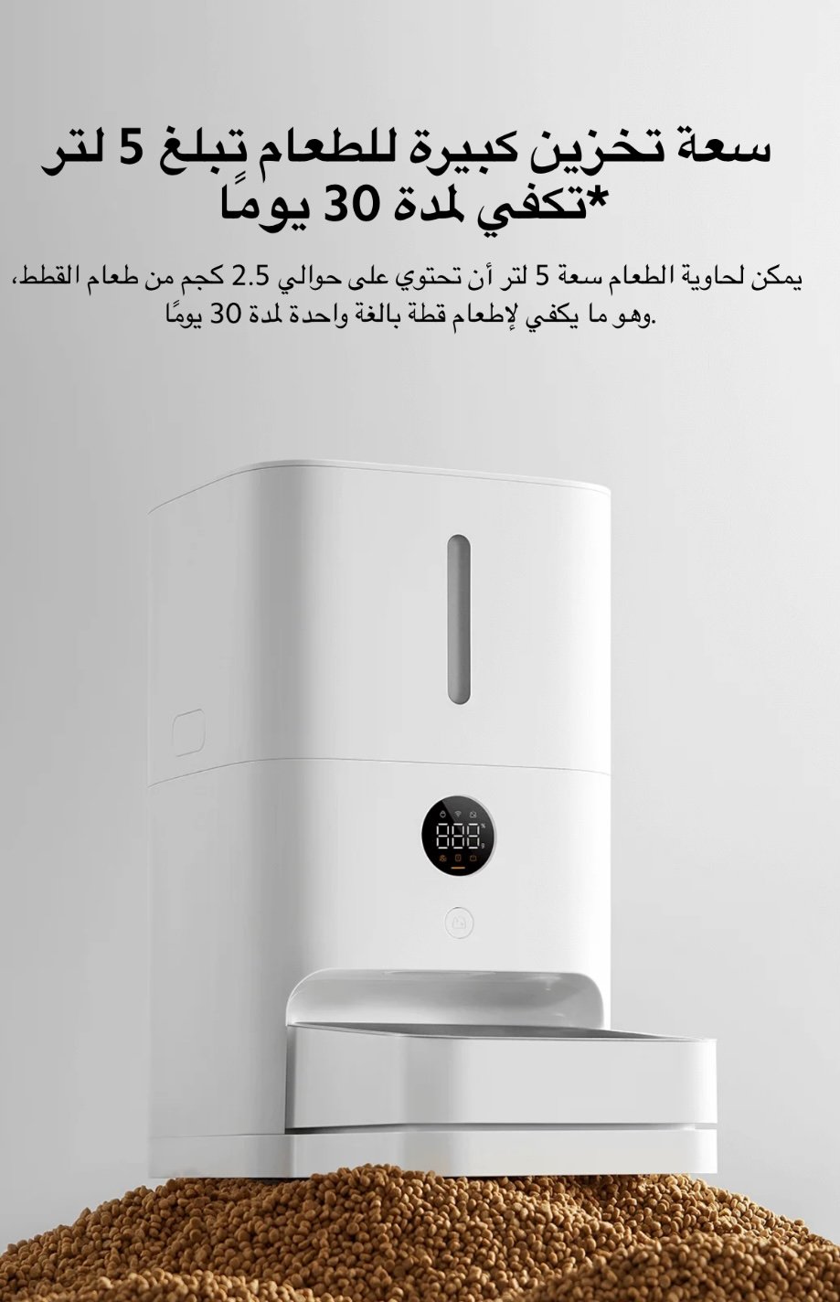 - سعة التخزين: 5 لتر، وهي سعة كبيرة تكفي لتخزين كمية كبيرة من طعام الحيوانات الأليفة الجاف، مما يغني عن الحاجة إلى ملء الموزع بشكل يومي. تكفي السعة حوالي 20 يومًا لحيوان أليف متوسط الحجم (قد تختلف حسب حجم واحتياجات الحيوان).