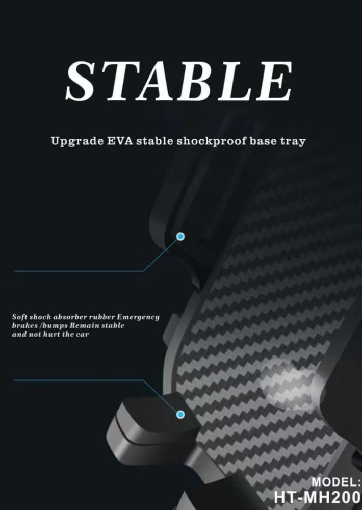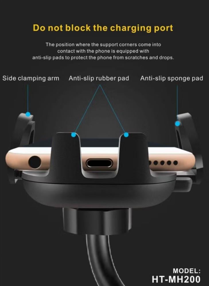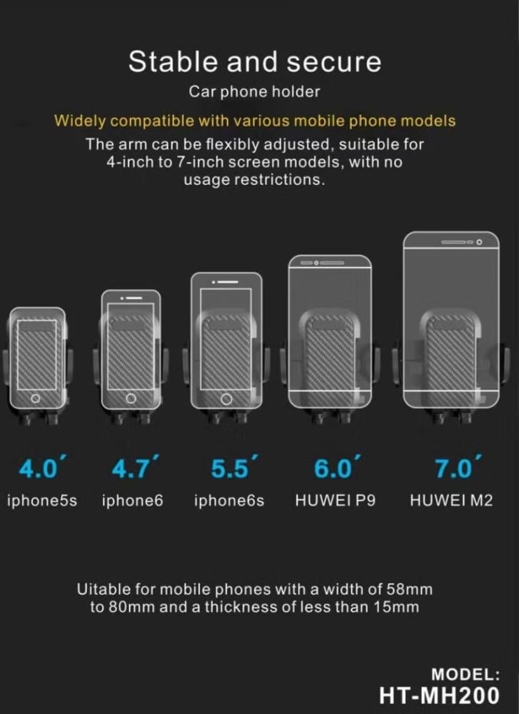 يتوافق مع معظم الهواتف الذكية من حجم 4 بوصة وحتى 7 بوصة، ويستوعب عرضًا من 58 ملم وحتى 80 ملم، وسماكة أقل من 15 ملم. لا يغطي منفذ الشحن، مما يتيح توصيل الشاحن بسهولة أثناء الاستخدام. قاعدة الحامل مزودة بوسادة مطاطية لامتصاص الصدمات ومنع التلف الناتج عن المطبات أو الفرامل المفاجئة